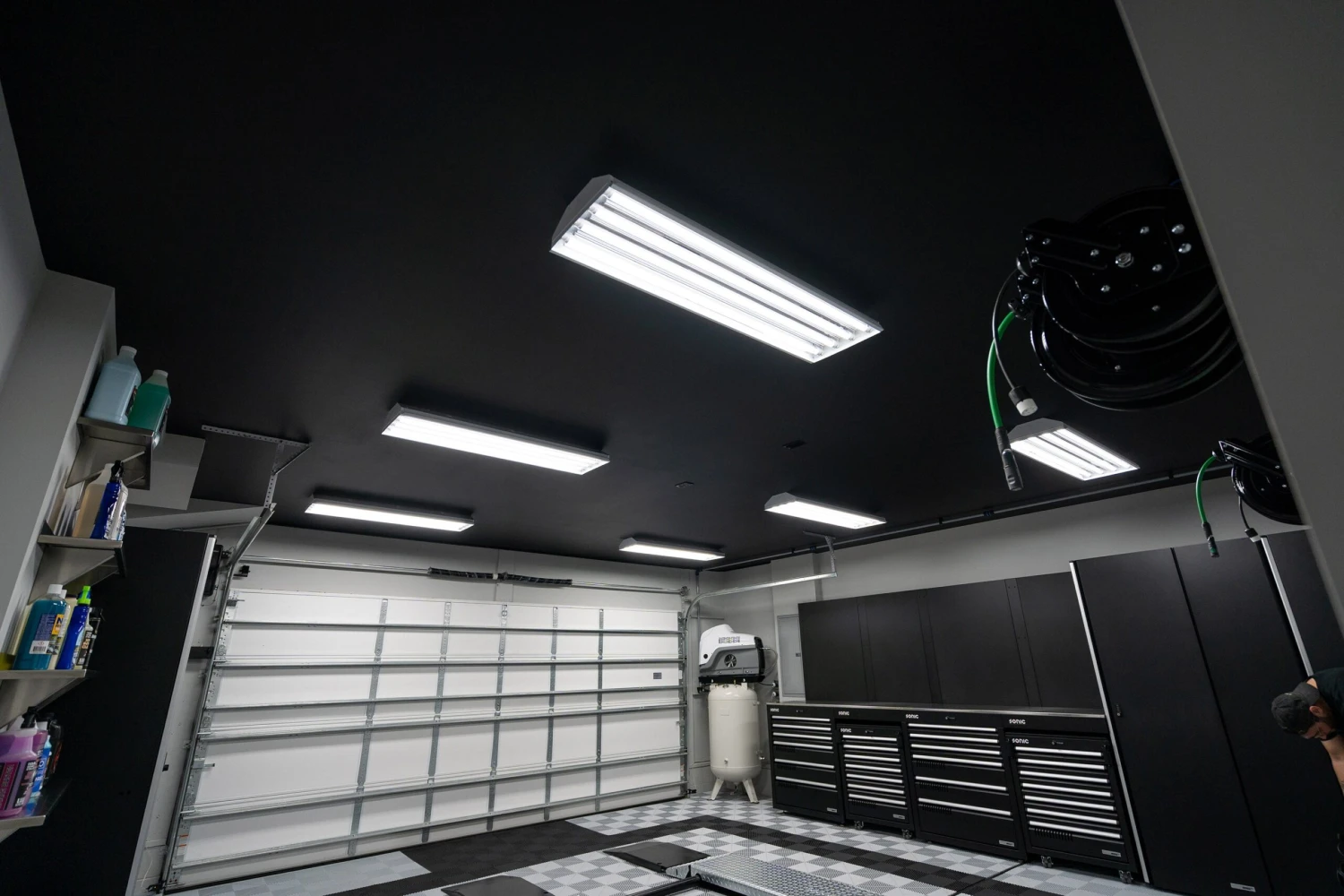Just like with the two-car version of this Basic Garage Lighting Solution, the three-car option continues the thought process of having three lights over each parking space in a garage. With this version of the solution, you’ll be creating a 3×3 grid of nine lights to build a really evenly lit and bright work environment. The way the frosted bulbs and shrouds work to defuse and direct the light means that these won’t be too harsh, even with their super high lumen output. 5000K is what we’ve landed on as the perfect temperature for a garage working environment for detailing and mechanic work.